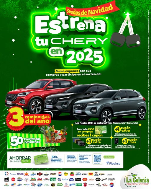 La cadena líder de las familias hondureñas te premia con tres espectaculares y elegantes camionetas Chery del año para que inicies con todo el 2025